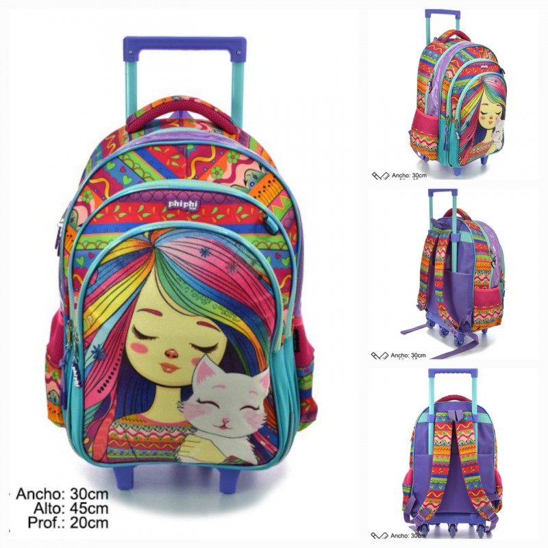 Mochila con carro mandala girl de 18". Con 3 divisiones (2 bolsillos frontales). Interior forrado. Bolsillos laterales, uno con red y otro con tapa. Correas para la espalda acolchadas y regulables. Capacidad 27 litros. carro y 3 ruedas se siliconas.. Medidas: Alto: 45 (52 con las ruedas), Ancho: 30 cm, y 20 cm de profundidad. Con la manija extendida mide 84,5 cm
