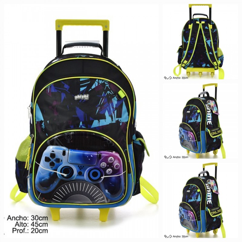 Mochila con carro Gaming de 18". Con 3 divisiones (la principal y 2 bolsillos, uno con efecto relieve) Interior forrado. Bolsillos laterales con red. Correas para la espalda, acolchadas y regulables. Capacidad 27 litros. Carro y 3 ruedas se siliconas. Medidas: Alto: 45 (52 con las ruedas), Ancho: 30 cm, y 20 cm de profundidad. Con la manija extendida mide 84,5 cm.