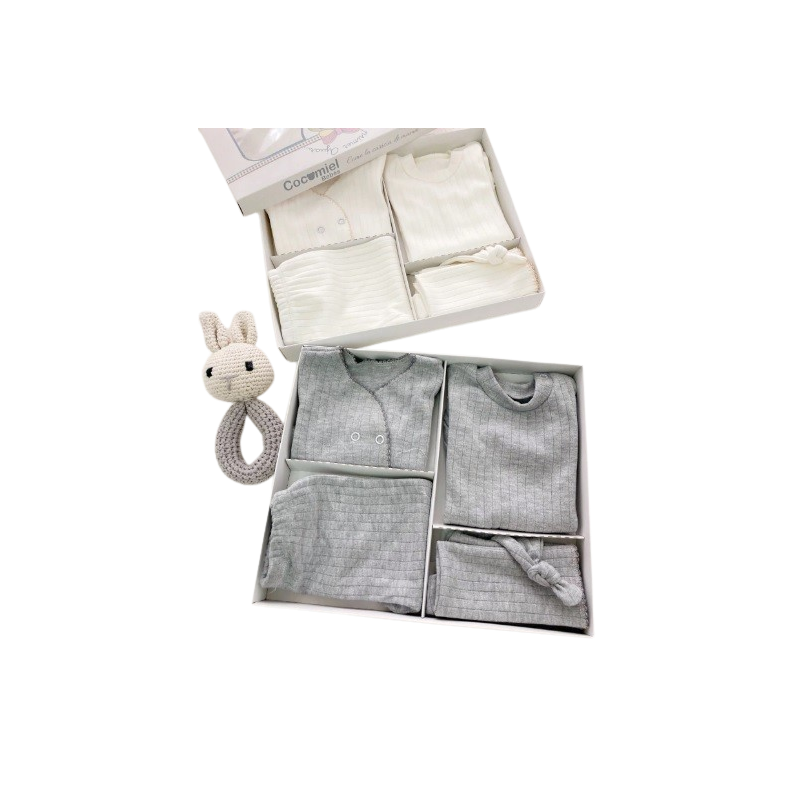 Ajuar de algodón desagujado con: manta, batita, ranita, gorro y babita.