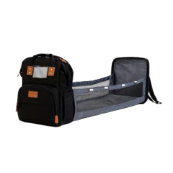 Mochila maternal que se convierte en cuna, con bolsillos con cierre. Puerto USB. Gran variedad de compartimientos para que los papas tengan todo bien organizado. Bolsillo delantero térmico para 3 mamaderas con detalles matelaseado. Detalles en cuero en contra tono. Incluye colchón, laterales ventilados. Tamaño ideal para llevar lo que necesita tu bebé.